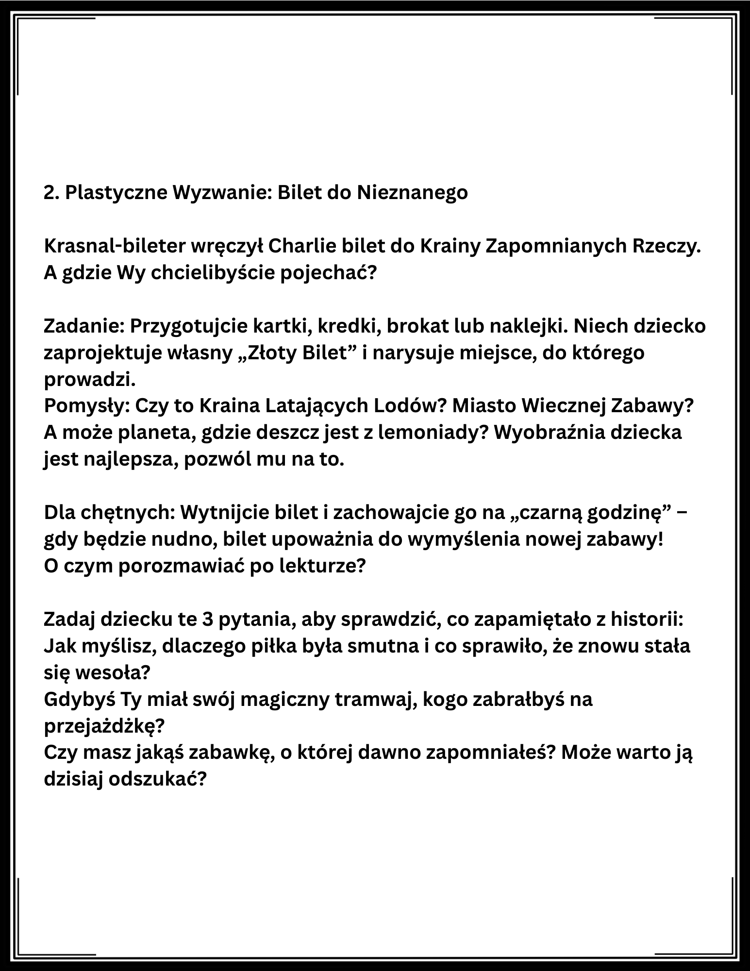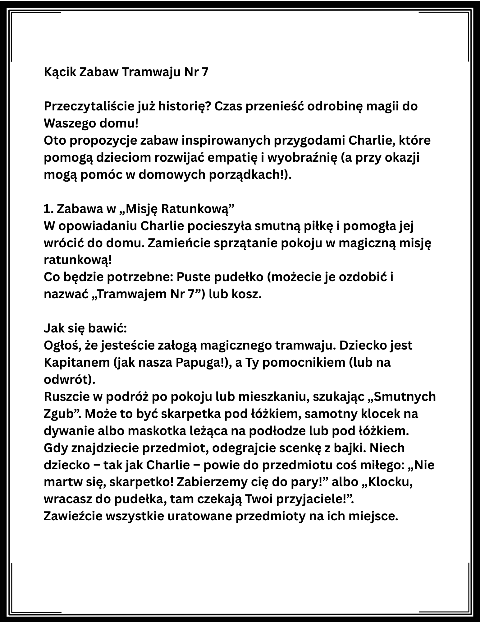 📖 1. Pełna Opowieść: Urocza historia o Charlie, która pewnego dnia wsiada do tramwaju kierowanego przez Papugę i odkrywa Krainę Zapomnianych Rzeczy. Tekst jest idealny do głośnego czytania przed snem – pełen magicznych dźwięków („ding! ding!”, „boing!”) i barwnych postaci.